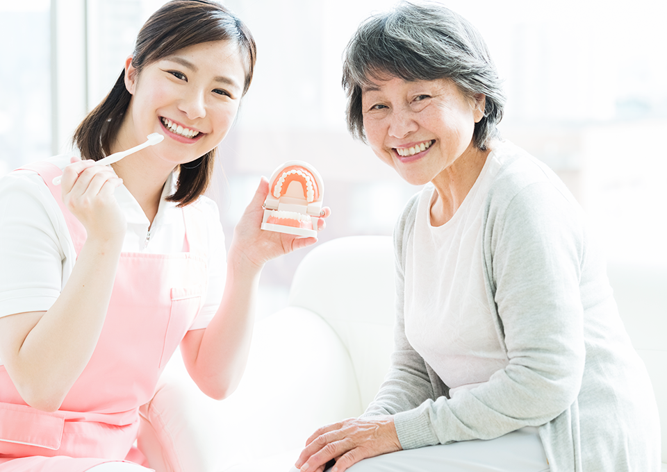 また、毎日のセルフケア方法を、ご家族の方や介護を担当されている方にもお伝えします。セルフケア方法を共有してもらうことが、むし歯や歯周病の予防につながるのです。